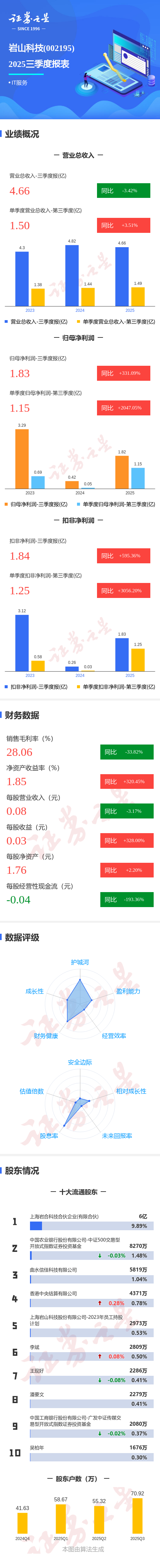 证券之星消息,岩山科技2025年三季报显示,公司主营收入4.66亿元,同比下降3.42%;归母净利润1.83亿元,同比上升331.09%;扣非净利润1.84亿元,同比上升595.37%;其中2025年第三季度,公司单季度主营收入1.5亿元,同比上升3.51%;单季度归母净利润1.15亿元,同比上升2047.05%;单季度扣非净利润1.25亿元,同比上升3056.21%;负债率3.32%,投资收益4.55亿元,财务费用-1836.5万元,毛利率28.06%。
