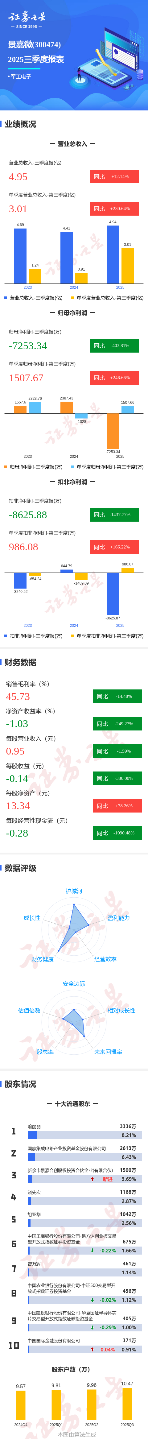 证券之星消息,景嘉微2025年三季报显示,公司主营收入4.95亿元,同比上升12.14%;归母净利润-7253.34万元,同比下降403.81%;扣非净利润-8625.88万元,同比下降1437.78%;其中2025年第三季度,公司单季度主营收入3.01亿元,同比上升230.65%;单季度归母净利润1507.67万元,同比上升246.66%;单季度扣非净利润986.08万元,同比上升166.22%;负债率10.32%,投资收益95.55万元,财务费用-524.09万元,毛利率45.73%。