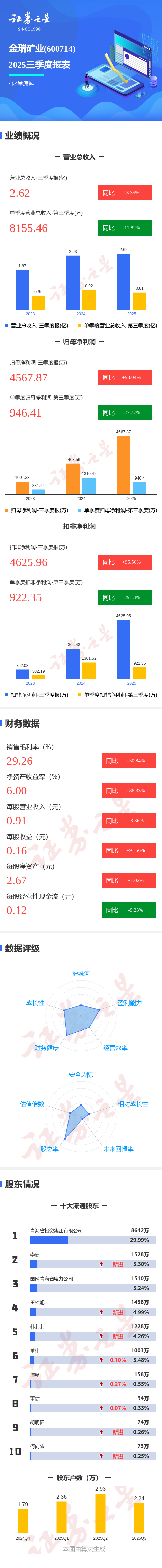 证券之星消息,金瑞矿业2025年三季报显示,公司主营收入2.62亿元,同比上升3.35%;归母净利润4567.87万元,同比上升90.05%;扣非净利润4625.96万元,同比上升95.56%;其中2025年第三季度,公司单季度主营收入8155.46万元,同比下降11.83%;单季度归母净利润946.41万元,同比下降27.78%;单季度扣非净利润922.35万元,同比下降29.13%;负债率9.36%,财务费用-461.81万元,毛利率29.26%。