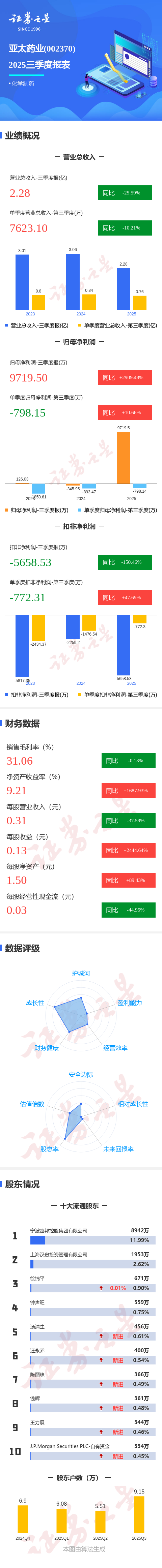 证券之星消息,亚太药业2025年三季报显示,公司主营收入2.28亿元,同比下降25.59%;归母净利润9719.5万元,同比上升2909.49%;扣非净利润-5658.53万元,同比下降150.47%;其中2025年第三季度,公司单季度主营收入7623.1万元,同比下降10.21%;单季度归母净利润-798.15万元,同比上升10.67%;单季度扣非净利润-772.31万元,同比上升47.69%;负债率7.64%,投资收益1.5亿元,财务费用2789.39万元,毛利率31.06%。