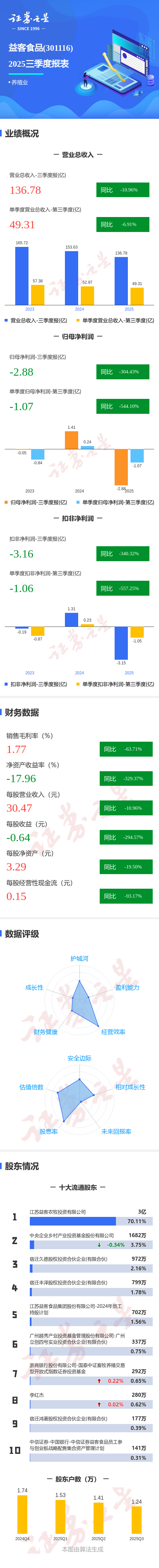 证券之星消息,益客食品2025年三季报显示,公司主营收入136.78亿元,同比下降10.97%;归母净利润-2.88亿元,同比下降304.43%;扣非净利润-3.16亿元,同比下降340.33%;其中2025年第三季度,公司单季度主营收入49.31亿元,同比下降6.92%;单季度归母净利润-1.07亿元,同比下降544.1%;单季度扣非净利润-1.06亿元,同比下降557.25%;负债率70.38%,投资收益-165.19万元,财务费用5138.3万元,毛利率1.77%。