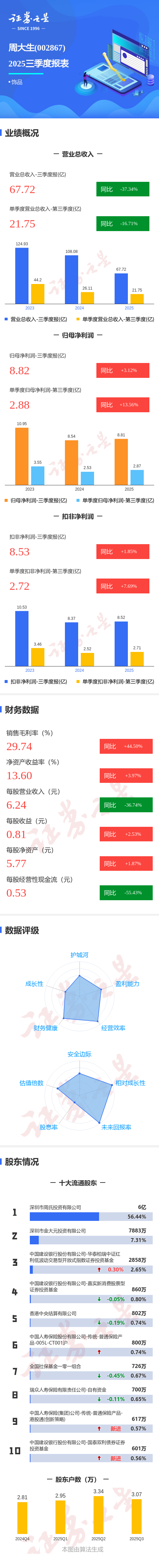 证券之星消息,周大生2025年三季报显示,公司主营收入67.72亿元,同比下降37.35%;归母净利润8.82亿元,同比上升3.13%;扣非净利润8.53亿元,同比上升1.85%;其中2025年第三季度,公司单季度主营收入21.75亿元,同比下降16.71%;单季度归母净利润2.88亿元,同比上升13.57%;单季度扣非净利润2.72亿元,同比上升7.69%;负债率23.65%,投资收益4914.53万元,财务费用630.16万元,毛利率29.74%。