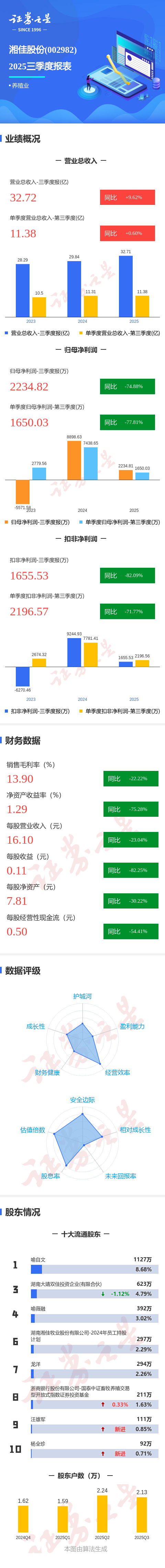 证券之星消息,湘佳股份2025年三季报显示,公司主营收入32.72亿元,同比上升9.63%;归母净利润2234.82万元,同比下降74.89%;扣非净利润1655.53万元,同比下降82.09%;其中2025年第三季度,公司单季度主营收入11.38亿元,同比上升0.6%;单季度归母净利润1650.03万元,同比下降77.82%;单季度扣非净利润2196.57万元,同比下降71.77%;负债率58.33%,投资收益69.75万元,财务费用4209.54万元,毛利率13.9%。