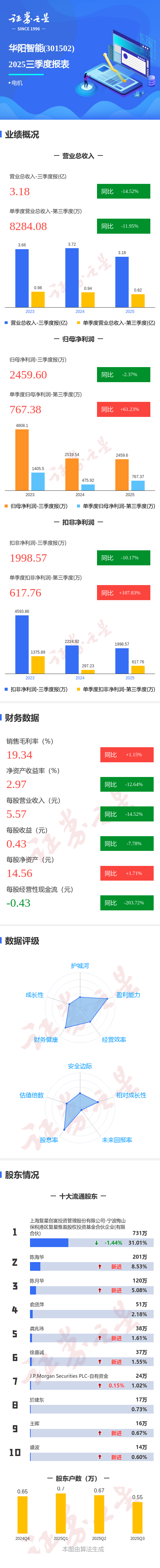 证券之星消息,华阳智能2025年三季报显示,公司主营收入3.18亿元,同比下降14.52%;归母净利润2459.6万元,同比下降2.38%;扣非净利润1998.57万元,同比下降10.17%;其中2025年第三季度,公司单季度主营收入8284.08万元,同比下降11.96%;单季度归母净利润767.38万元,同比上升61.24%;单季度扣非净利润617.76万元,同比上升107.84%;负债率23.36%,投资收益244.57万元,财务费用50.68万元,毛利率19.34%。