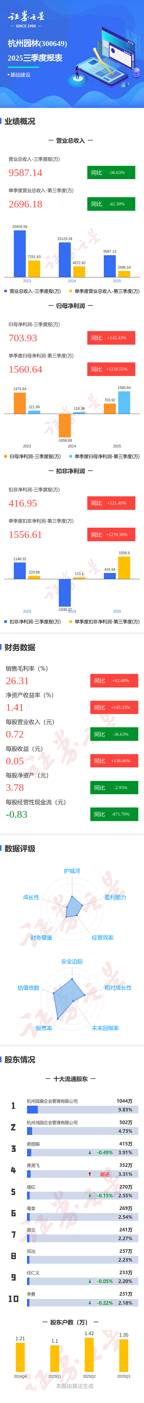 证券之星消息,杭州园林2025年三季报显示,公司主营收入9587.14万元,同比下降36.63%;归母净利润703.93万元,同比上升142.43%;扣非净利润416.95万元,同比上升121.5%;其中2025年第三季度,公司单季度主营收入2696.18万元,同比下降42.3%;单季度归母净利润1560.64万元,同比上升1218.56%;单季度扣非净利润1556.61万元,同比上升1276.3%;负债率44.54%,投资收益259.84万元,财务费用-52.15万元,毛利率26.31%。