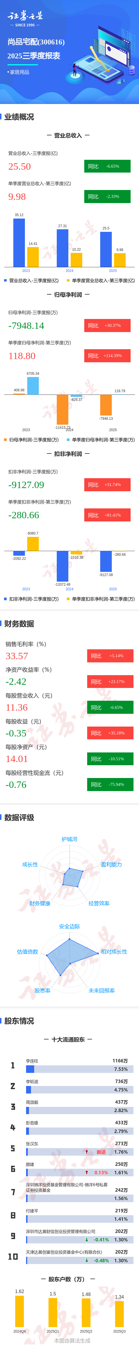 证券之星消息,尚品宅配2025年三季报显示,公司主营收入25.5亿元,同比下降6.66%;归母净利润-7948.14万元,同比上升30.38%;扣非净利润-9127.09万元,同比上升31.75%;其中2025年第三季度,公司单季度主营收入9.98亿元,同比下降2.34%;单季度归母净利润118.8万元,同比上升114.39%;单季度扣非净利润-280.66万元,同比上升81.42%;负债率56.35%,投资收益1469.98万元,财务费用2489.65万元,毛利率33.57%。