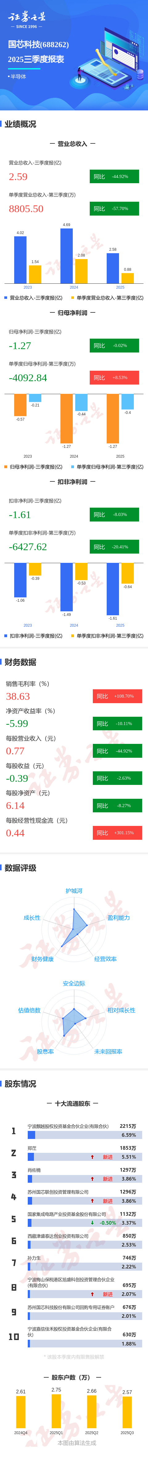 证券之星消息,国芯科技2025年三季报显示,公司主营收入2.59亿元,同比下降44.92%;归母净利润-1.27亿元,同比下降0.03%;扣非净利润-1.61亿元,同比下降8.03%;其中2025年第三季度,公司单季度主营收入8805.5万元,同比下降57.7%;单季度归母净利润-4092.84万元,同比上升8.53%;单季度扣非净利润-6427.62万元,同比下降20.41%;负债率36.48%,投资收益342.5万元,财务费用124.43万元,毛利率38.63%。