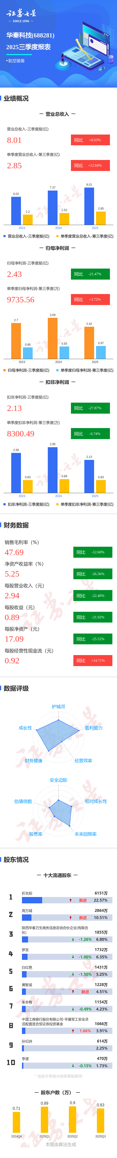 证券之星消息,华秦科技2025年三季报显示,公司主营收入8.01亿元,同比上升8.63%;归母净利润2.43亿元,同比下降21.48%;扣非净利润2.13亿元,同比下降27.87%;其中2025年第三季度,公司单季度主营收入2.85亿元,同比上升12.85%;单季度归母净利润9735.56万元,同比上升3.73%;单季度扣非净利润8300.49万元,同比下降6.75%;负债率27.01%,投资收益3643.5万元,财务费用1580.08万元,毛利率47.69%。