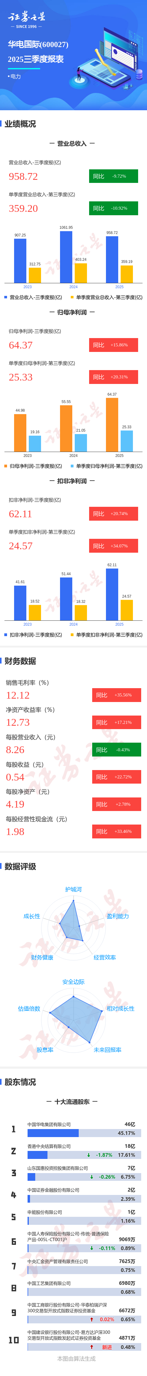 证券之星消息,华电国际2025年三季报显示,公司主营收入958.72亿元,同比下降9.72%;归母净利润64.37亿元,同比上升15.87%;扣非净利润62.11亿元,同比上升20.74%;其中2025年第三季度,公司单季度主营收入359.2亿元,同比下降10.92%;单季度归母净利润25.33亿元,同比上升20.32%;单季度扣非净利润24.57亿元,同比上升34.08%;负债率60.41%,投资收益30.78亿元,财务费用24.14亿元,毛利率12.12%。