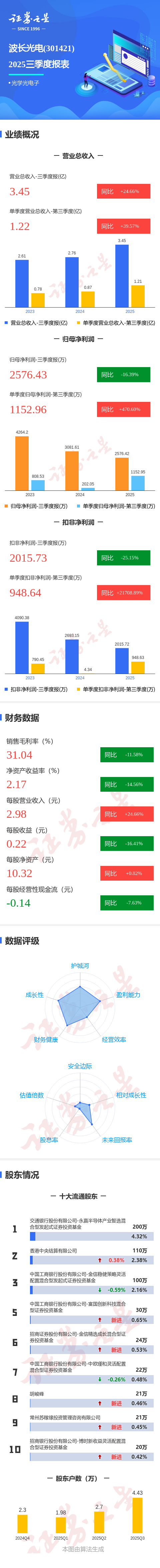 证券之星消息,波长光电2025年三季报显示,公司主营收入3.45亿元,同比上升24.66%;归母净利润2576.43万元,同比下降16.39%;扣非净利润2015.73万元,同比下降25.15%;其中2025年第三季度,公司单季度主营收入1.22亿元,同比上升39.57%;单季度归母净利润1152.96万元,同比上升470.61%;单季度扣非净利润948.64万元,同比上升21708.89%;负债率12.95%,投资收益504.46万元,财务费用-106.07万元,毛利率31.04%。