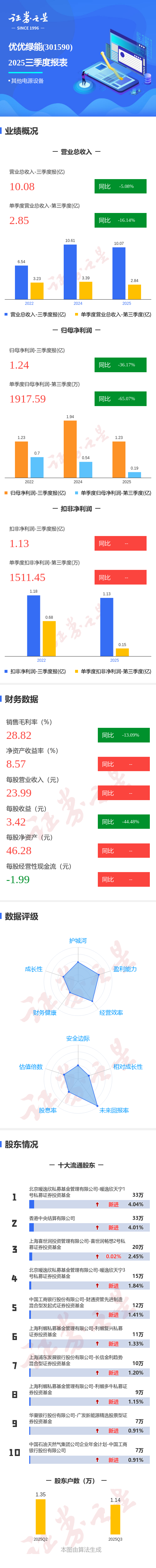 证券之星消息,优优绿能2025年三季报显示,公司主营收入10.08亿元,同比下降5.09%;归母净利润1.24亿元,同比下降36.18%;扣非净利润1.13亿元,其中2025年第三季度,公司单季度主营收入2.85亿元,同比下降16.14%;单季度归母净利润1917.59万元,同比下降65.07%;单季度扣非净利润1511.45万元,负债率26.32%,投资收益534.53万元,财务费用-355.18万元,毛利率28.82%。