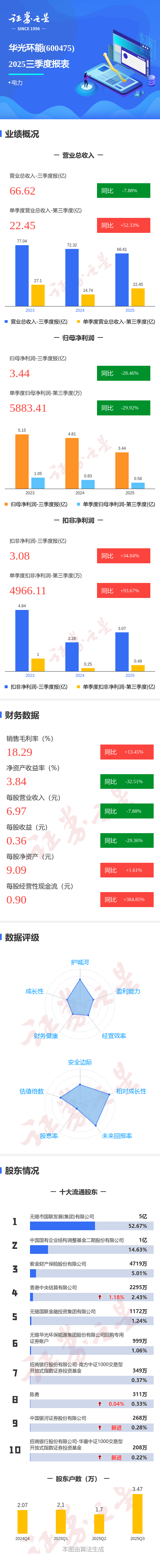 证券之星消息,华光环能2025年三季报显示,公司主营收入66.62亿元,同比下降7.89%;归母净利润3.44亿元,同比下降28.46%;扣非净利润3.08亿元,同比上升34.85%;其中2025年第三季度,公司单季度主营收入22.45亿元,同比上升52.33%;单季度归母净利润5883.41万元,同比下降29.92%;单季度扣非净利润4966.11万元,同比上升93.68%;负债率60.72%,投资收益1.35亿元,财务费用1.24亿元,毛利率18.29%。