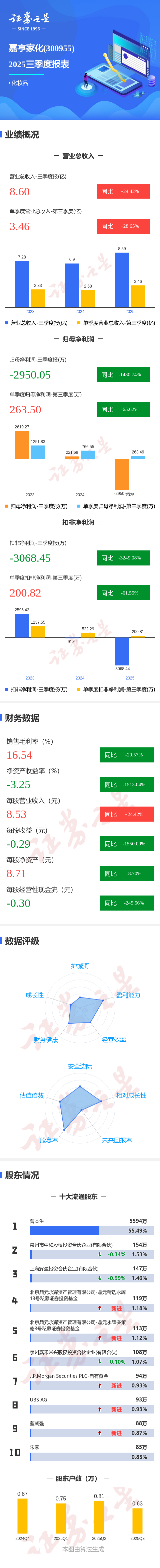 证券之星消息,嘉亨家化2025年三季报显示,公司主营收入8.6亿元,同比上升24.42%;归母净利润-2950.05万元,同比下降1430.74%;扣非净利润-3068.45万元,同比下降3249.08%;其中2025年第三季度,公司单季度主营收入3.46亿元,同比上升28.66%;单季度归母净利润263.5万元,同比下降65.63%;单季度扣非净利润200.82万元,同比下降61.55%;负债率54.19%,财务费用1635.98万元,毛利率16.54%。