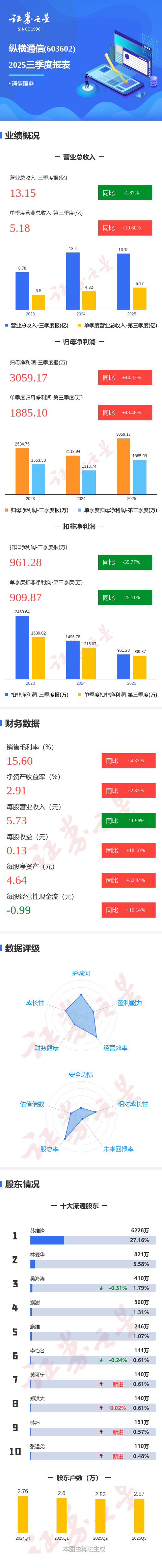 证券之星消息,纵横通信2025年三季报显示,公司主营收入13.15亿元,同比下降1.87%;归母净利润3059.17万元,同比上升44.37%;扣非净利润961.28万元,同比下降35.78%;其中2025年第三季度,公司单季度主营收入5.18亿元,同比上升19.61%;单季度归母净利润1885.1万元,同比上升43.49%;单季度扣非净利润909.87万元,同比下降25.12%;负债率57.25%,投资收益688.28万元,财务费用2293.75万元,毛利率15.6%。