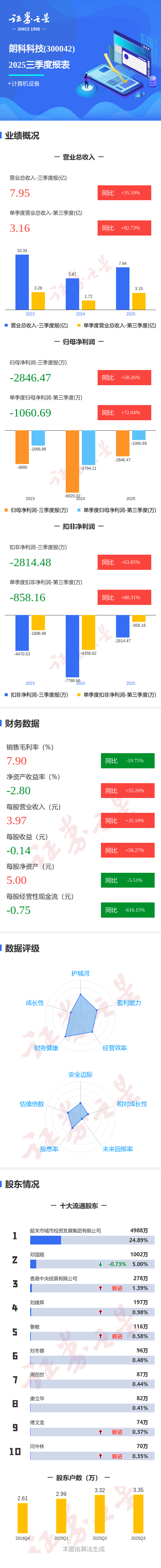 证券之星消息,朗科科技2025年三季报显示,公司主营收入7.95亿元,同比上升35.19%;归母净利润-2846.47万元,同比上升58.26%;扣非净利润-2814.48万元,同比上升63.86%;其中2025年第三季度,公司单季度主营收入3.16亿元,同比上升82.73%;单季度归母净利润-1060.69万元,同比上升72.04%;单季度扣非净利润-858.16万元,同比上升80.31%;负债率22.3%,投资收益-417.63万元,财务费用-738.78万元,毛利率7.9%。