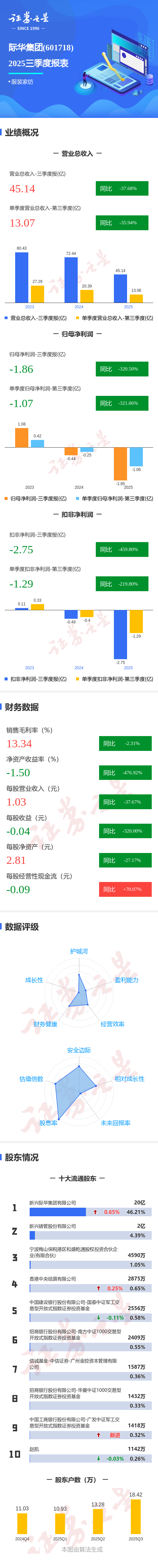 证券之星消息,际华集团2025年三季报显示,公司主营收入45.14亿元,同比下降37.68%;归母净利润-1.86亿元,同比下降320.5%;扣非净利润-2.75亿元,同比下降459.8%;其中2025年第三季度,公司单季度主营收入13.07亿元,同比下降35.94%;单季度归母净利润-1.07亿元,同比下降321.06%;单季度扣非净利润-1.29亿元,同比下降219.8%;负债率39.36%,投资收益2633.61万元,财务费用-1358.16万元,毛利率13.34%。