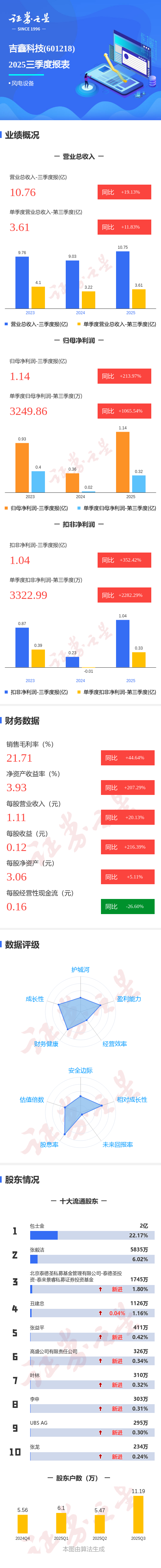 证券之星消息,吉鑫科技2025年三季报显示,公司主营收入10.76亿元,同比上升19.14%;归母净利润1.14亿元,同比上升213.98%;扣非净利润1.04亿元,同比上升352.43%;其中2025年第三季度,公司单季度主营收入3.61亿元,同比上升11.84%;单季度归母净利润3249.86万元,同比上升1065.54%;单季度扣非净利润3322.99万元,同比上升2282.3%;负债率20.36%,投资收益1812.98万元,财务费用1034.65万元,毛利率21.71%。