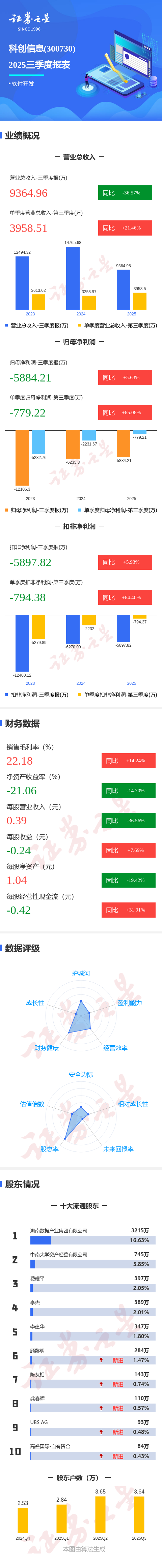 证券之星消息,科创信息2025年三季报显示,公司主营收入9364.96万元,同比下降36.58%;归母净利润-5884.21万元,同比上升5.63%;扣非净利润-5897.82万元,同比上升5.94%;其中2025年第三季度,公司单季度主营收入3958.51万元,同比上升21.46%;单季度归母净利润-779.22万元,同比上升65.08%;单季度扣非净利润-794.38万元,同比上升64.41%;负债率66.55%,投资收益-1.05万元,财务费用628.25万元,毛利率22.18%。