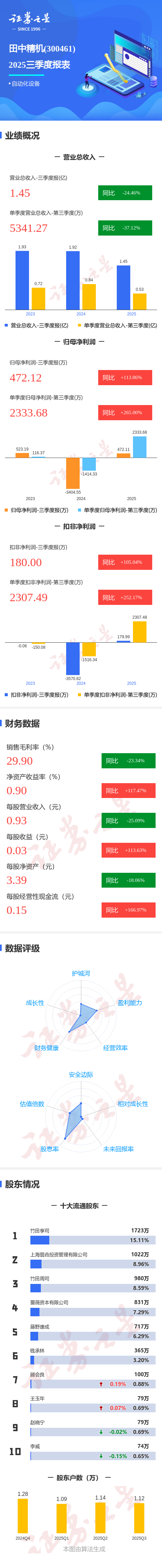 证券之星消息,田中精机2025年三季报显示,公司主营收入1.45亿元,同比下降24.46%;归母净利润472.12万元,同比上升113.87%;扣非净利润180.0万元,同比上升105.04%;其中2025年第三季度,公司单季度主营收入5341.27万元,同比下降37.13%;单季度归母净利润2333.68万元,同比上升265.0%;单季度扣非净利润2307.49万元,同比上升252.17%;负债率33.9%,投资收益2160.7万元,财务费用390.04万元,毛利率29.9%。
