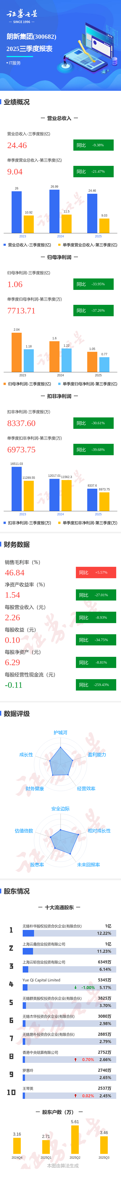 证券之星消息,朗新集团2025年三季报显示,公司主营收入24.46亿元,同比下降9.38%;归母净利润1.06亿元,同比下降33.95%;扣非净利润8337.6万元,同比下降30.62%;其中2025年第三季度,公司单季度主营收入9.04亿元,同比下降21.48%;单季度归母净利润7713.71万元,同比下降37.26%;单季度扣非净利润6973.75万元,同比下降39.69%;负债率26.23%,投资收益770.99万元,财务费用-747.12万元,毛利率46.84%。