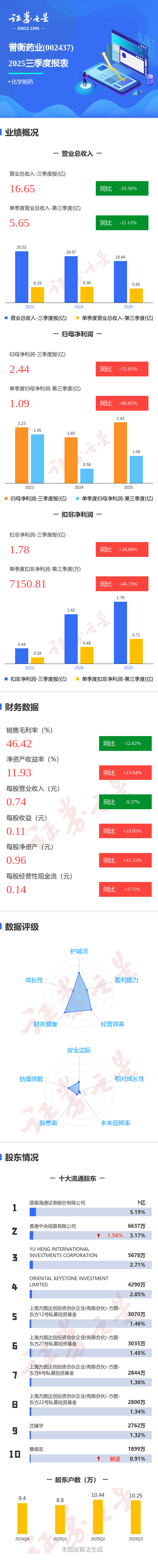 证券之星消息,誉衡药业2025年三季报显示,公司主营收入16.65亿元,同比下降10.36%;归母净利润2.44亿元,同比上升32.85%;扣非净利润1.78亿元,同比上升24.69%;其中2025年第三季度,公司单季度主营收入5.65亿元,同比下降11.11%;单季度归母净利润1.09亿元,同比上升86.86%;单季度扣非净利润7150.81万元,同比上升46.74%;负债率28.13%,投资收益-56.54万元,财务费用-52.84万元,毛利率46.42%。