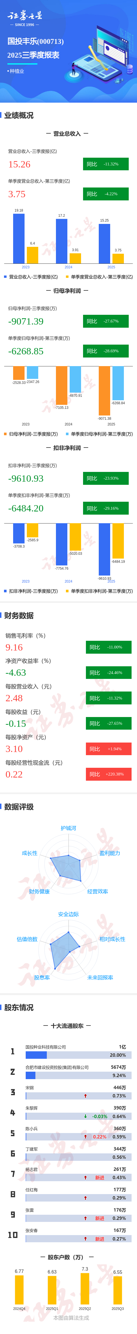 证券之星消息,国投丰乐2025年三季报显示,公司主营收入15.26亿元,同比下降11.33%;归母净利润-9071.39万元,同比下降27.67%;扣非净利润-9610.93万元,同比下降23.94%;其中2025年第三季度,公司单季度主营收入3.75亿元,同比下降4.23%;单季度归母净利润-6268.85万元,同比下降28.7%;单季度扣非净利润-6484.2万元,同比下降29.17%;负债率43.75%,投资收益183.07万元,财务费用336.55万元,毛利率9.16%。