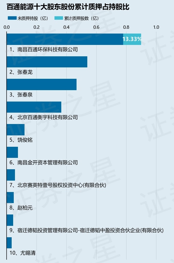 截止本公告日,股东南昌百通环保科技有限公司已累计质押股份1200.0万股,占其持股总数的13.33%。本次质押后百通能源十大股东的累计质押股份占持股比例(占持股比例的计算以公司最新一期财务报表公布的十大股东的持股总数为基准)见下图: