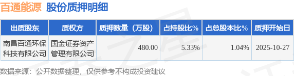 证券之星消息,百通能源(001376)10月28日公开信息显示,股东南昌百通环保科技有限公司向国金证券资产管理有限公司合计质押480.0万股,占总股本1.04%。质押详情见下表: