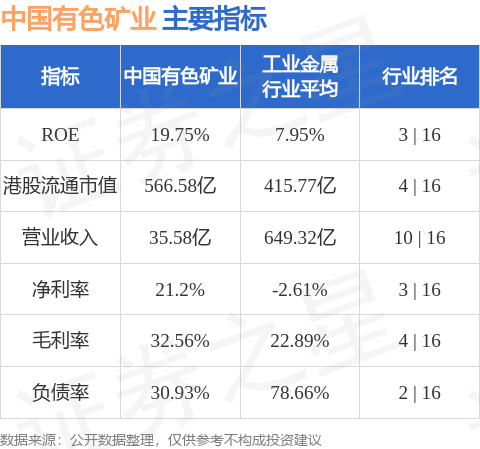 中国有色矿业港股市值566.58亿港元,在工业金属行业中排名第4。主要指标见下表: