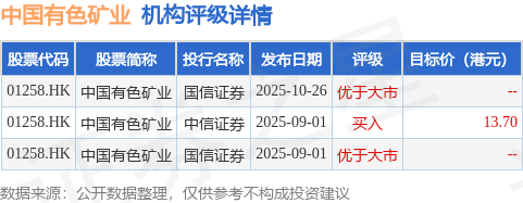 截至2025年10月28日收盘,中国有色矿业(01258.HK)报收于14.02港元,下跌3.44%,成交量1707.62万股,成交额2.42亿港元。投行对该股的评级以优于大市为主,近90天内共有2家投行给出优于大市评级,近90天的目标均价为13.7港元。国信证券最新一份研报给予中国有色矿业优于大市评级。