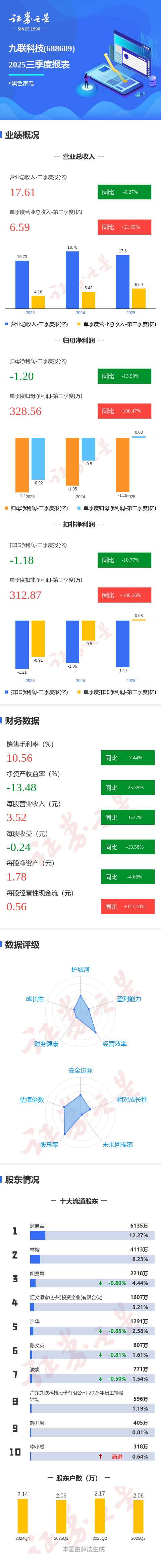 证券之星消息,九联科技2025年三季报显示,公司主营收入17.61亿元,同比下降6.28%;归母净利润-1.2亿元,同比下降13.99%;扣非净利润-1.18亿元,同比下降10.78%;其中2025年第三季度,公司单季度主营收入6.59亿元,同比上升21.65%;单季度归母净利润328.56万元,同比上升106.48%;单季度扣非净利润312.87万元,同比上升106.17%;负债率73.51%,投资收益109.67万元,财务费用3386.09万元,毛利率10.56%。