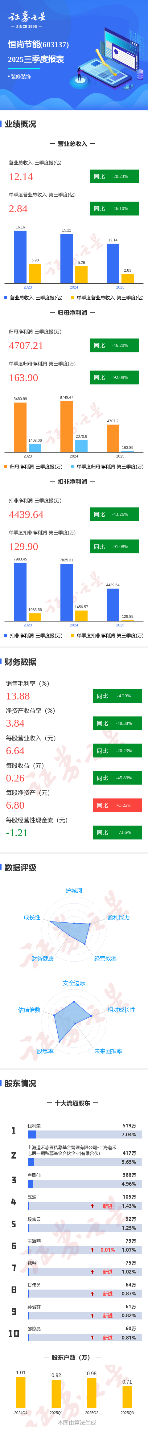 证券之星消息,恒尚节能2025年三季报显示,公司主营收入12.14亿元,同比下降20.24%;归母净利润4707.21万元,同比下降46.2%;扣非净利润4439.64万元,同比下降43.27%;其中2025年第三季度,公司单季度主营收入2.84亿元,同比下降46.1%;单季度归母净利润163.9万元,同比下降92.08%;单季度扣非净利润129.9万元,同比下降91.08%;负债率60.73%,投资收益170.1万元,财务费用1340.54万元,毛利率13.88%。