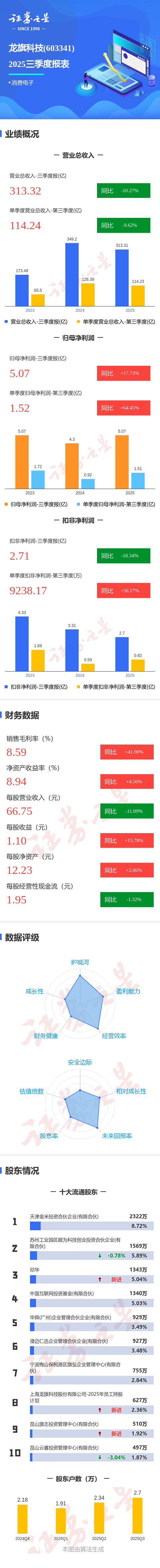 证券之星消息,龙旗科技2025年三季报显示,公司主营收入313.32亿元,同比下降10.28%;归母净利润5.07亿元,同比上升17.74%;扣非净利润2.71亿元,同比下降18.35%;其中2025年第三季度,公司单季度主营收入114.24亿元,同比下降9.62%;单季度归母净利润1.52亿元,同比上升64.46%;单季度扣非净利润9238.17万元,同比上升56.18%;负债率78.98%,投资收益3201.7万元,财务费用-3403.06万元,毛利率8.59%。