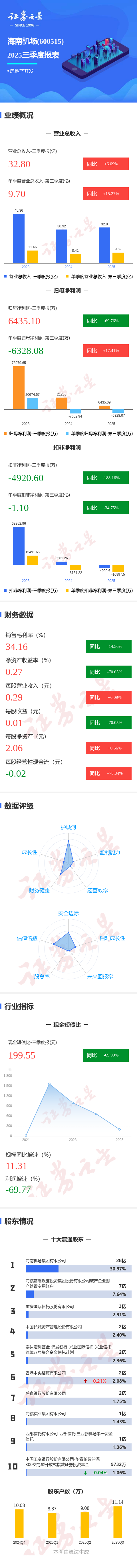 证券之星消息,海南机场2025年三季报显示,公司主营收入32.8亿元,同比上升6.09%;归母净利润6435.1万元,同比下降69.77%;扣非净利润-4920.6万元,同比下降188.16%;其中2025年第三季度,公司单季度主营收入9.7亿元,同比上升15.28%;单季度归母净利润-6328.08万元,同比上升17.42%;单季度扣非净利润-1.1亿元,同比下降34.75%;负债率51.34%,投资收益1010.12万元,财务费用3.6亿元,毛利率34.16%。