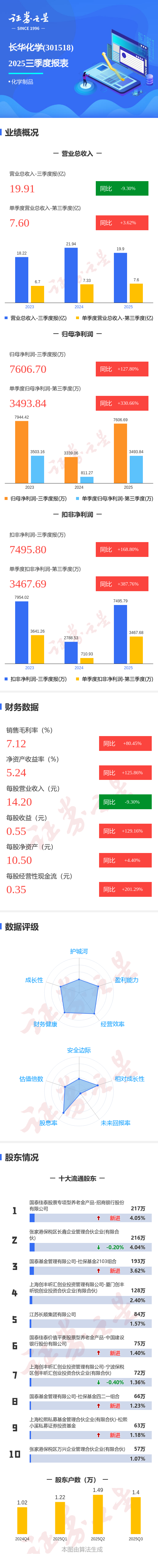 证券之星消息,长华化学2025年三季报显示,公司主营收入19.91亿元,同比下降9.31%;归母净利润7606.7万元,同比上升127.81%;扣非净利润7495.8万元,同比上升168.81%;其中2025年第三季度,公司单季度主营收入7.6亿元,同比上升3.62%;单季度归母净利润3493.84万元,同比上升330.66%;单季度扣非净利润3467.69万元,同比上升387.76%;负债率43.98%,投资收益75.69万元,财务费用-153.95万元,毛利率7.12%。