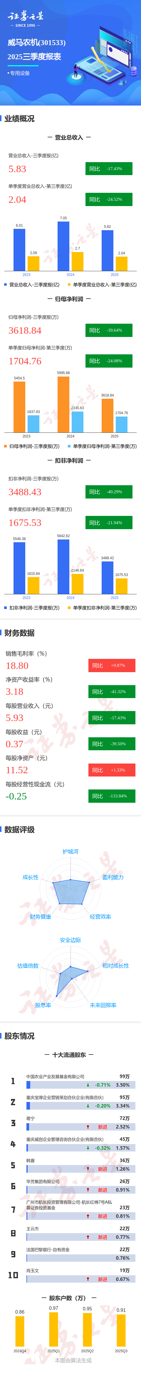 证券之星消息,威马农机2025年三季报显示,公司主营收入5.83亿元,同比下降17.43%;归母净利润3618.84万元,同比下降39.64%;扣非净利润3488.43万元,同比下降40.29%;其中2025年第三季度,公司单季度主营收入2.04亿元,同比下降24.53%;单季度归母净利润1704.76万元,同比下降24.09%;单季度扣非净利润1675.53万元,同比下降21.95%;负债率17.85%,投资收益61.18万元,财务费用-695.47万元,毛利率18.8%。