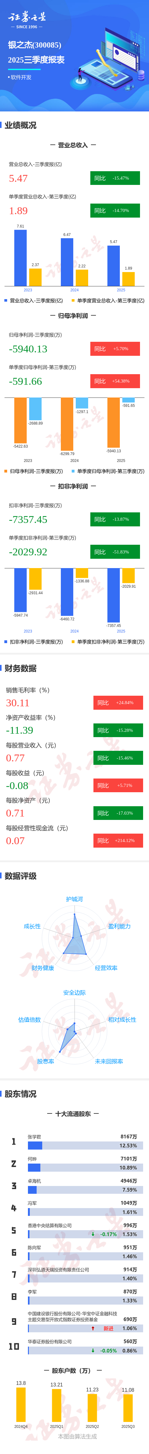 证券之星消息,银之杰2025年三季报显示,公司主营收入5.47亿元,同比下降15.48%;归母净利润-5940.13万元,同比上升5.71%;扣非净利润-7357.45万元,同比下降13.88%;其中2025年第三季度,公司单季度主营收入1.89亿元,同比下降14.71%;单季度归母净利润-591.66万元,同比上升54.39%;单季度扣非净利润-2029.92万元,同比下降51.84%;负债率48.87%,投资收益-627.55万元,财务费用542.79万元,毛利率30.11%。
