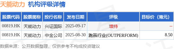 截至2025年10月28日收盘,天能动力(00819.HK)报收于8.4港元,下跌0.94%,成交量642.6万股,成交额5383.54万港元。投行对该股的评级以跑赢行业(OUTPERFORM)为主,近90天内共有1家投行给出跑赢行业(OUTPERFORM)评级,近90天的目标均价为8.5港元。兴证国际最新一份研报给予天能动力增持评级。