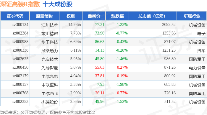 资金流向方面,深证高装R(470037)指数成份股当日主力资金净流出合计1.59亿元,游资资金净流出合计1.06亿元,散户资金净流入合计2.65亿元。成份股资金流向详情见下表: