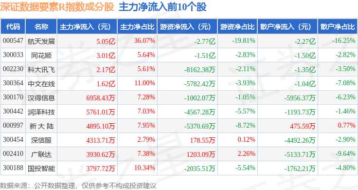 资金流向方面,深证数据要素R(470053)指数成份股当日主力资金净流出合计4.69亿元,游资资金净流出合计7.01亿元,散户资金净流入合计11.71亿元。成份股资金流向详情见下表: