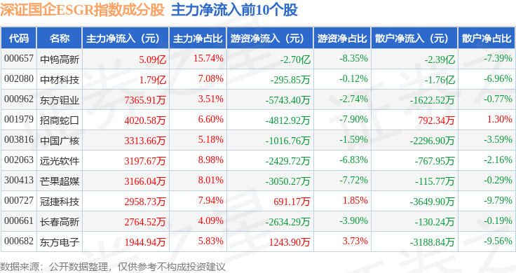 资金流向方面,深证国企ESGR(470055)指数成份股当日主力资金净流出合计9.87亿元,游资资金净流出合计8940.07万元,散户资金净流入合计10.76亿元。成份股资金流向详情见下表: