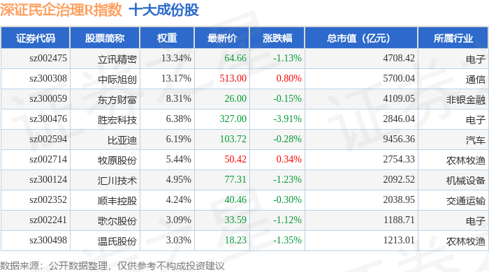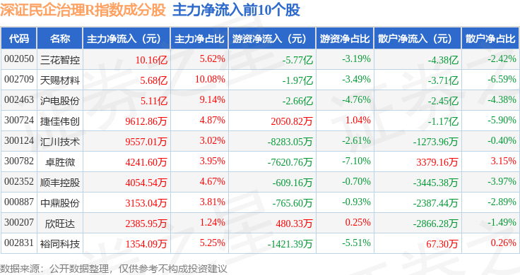 资金流向方面,深证民企治理R(470058)指数成份股当日主力资金净流出合计37.17亿元,游资资金净流入合计14.82亿元,散户资金净流入合计22.36亿元。成份股资金流向详情见下表: