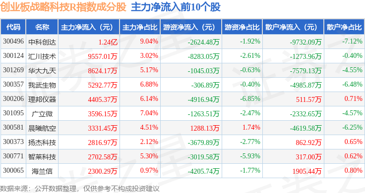 资金流向方面,创业板战略科技R(471004)指数成份股当日主力资金净流出合计16.17亿元,游资资金净流入合计3.89亿元,散户资金净流入合计12.28亿元。成份股资金流向详情见下表: