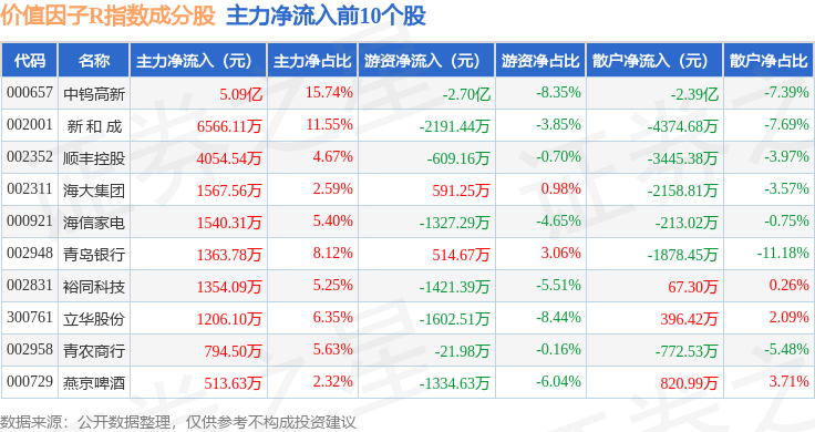 资金流向方面,价值因子R(480056)指数成份股当日主力资金净流出合计12.87亿元,游资资金净流入合计6.53亿元,散户资金净流入合计6.35亿元。成份股资金流向详情见下表: