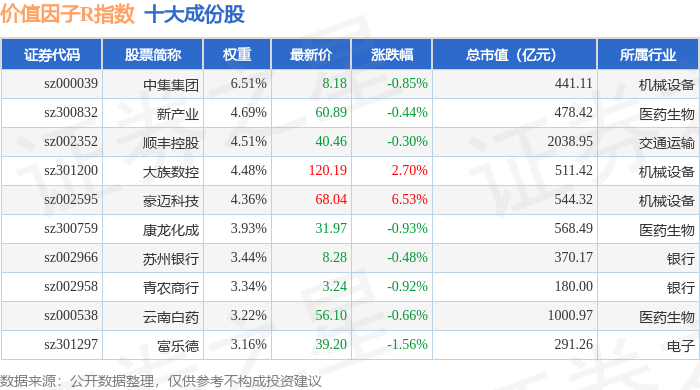 证券之星消息,10月28日,价值因子R(480056)指数报收于3116.77点,跌0.21%,成交403.13亿元,换手率1.12%。当日该指数成份股中,上涨的有13家,中钨高新以10.02%的涨幅领涨,下跌的有37家,大金重工以8.51%的跌幅领跌。