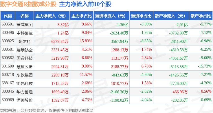 资金流向方面,数字交通R(480075)指数成份股当日主力资金净流出合计10.8亿元,游资资金净流入合计6062.44万元,散户资金净流入合计10.19亿元。成份股资金流向详情见下表: