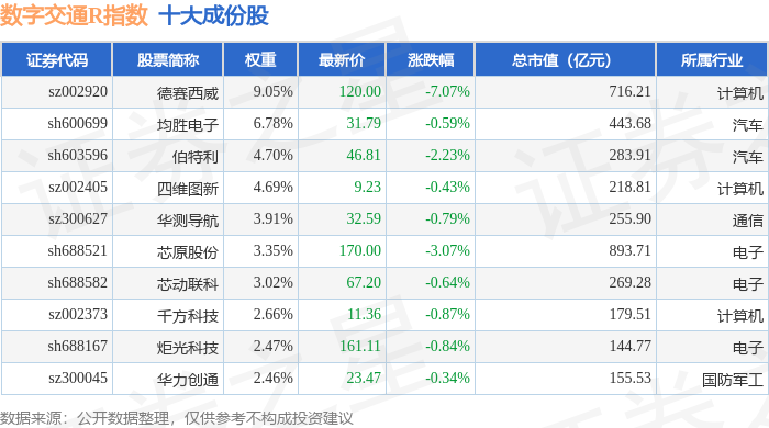 证券之星消息,10月28日,数字交通R(480075)指数报收于3450.53点,跌0.75%,成交351.97亿元,换手率2.32%。当日该指数成份股中,上涨的有22家,阿尔特以6.33%的涨幅领涨,下跌的有26家,德赛西威以7.07%的跌幅领跌。