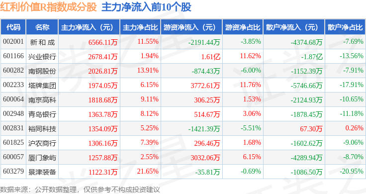 资金流向方面,红利价值R(489016)指数成份股当日主力资金净流出合计16.4亿元,游资资金净流入合计12.44亿元,散户资金净流入合计3.96亿元。成份股资金流向详情见下表:
