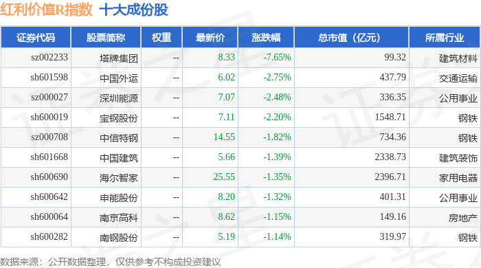 证券之星消息,10月28日,红利价值R(489016)指数报收于7679.26点,跌0.2%,成交283.74亿元,换手率0.29%。当日该指数成份股中,上涨的有14家,康力电梯以7.33%的涨幅领涨,下跌的有36家,塔牌集团以7.65%的跌幅领跌。