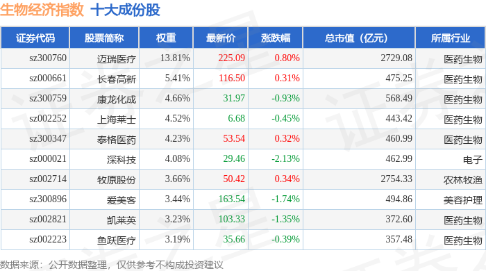 证券之星消息,10月28日,生物经济(970038)指数报收于2277.51点,跌0.16%,成交188.83亿元,换手率1.2%。当日该指数成份股中,上涨的有23家,我武生物以6.71%的涨幅领涨,下跌的有27家,美亚光电以3.02%的跌幅领跌。